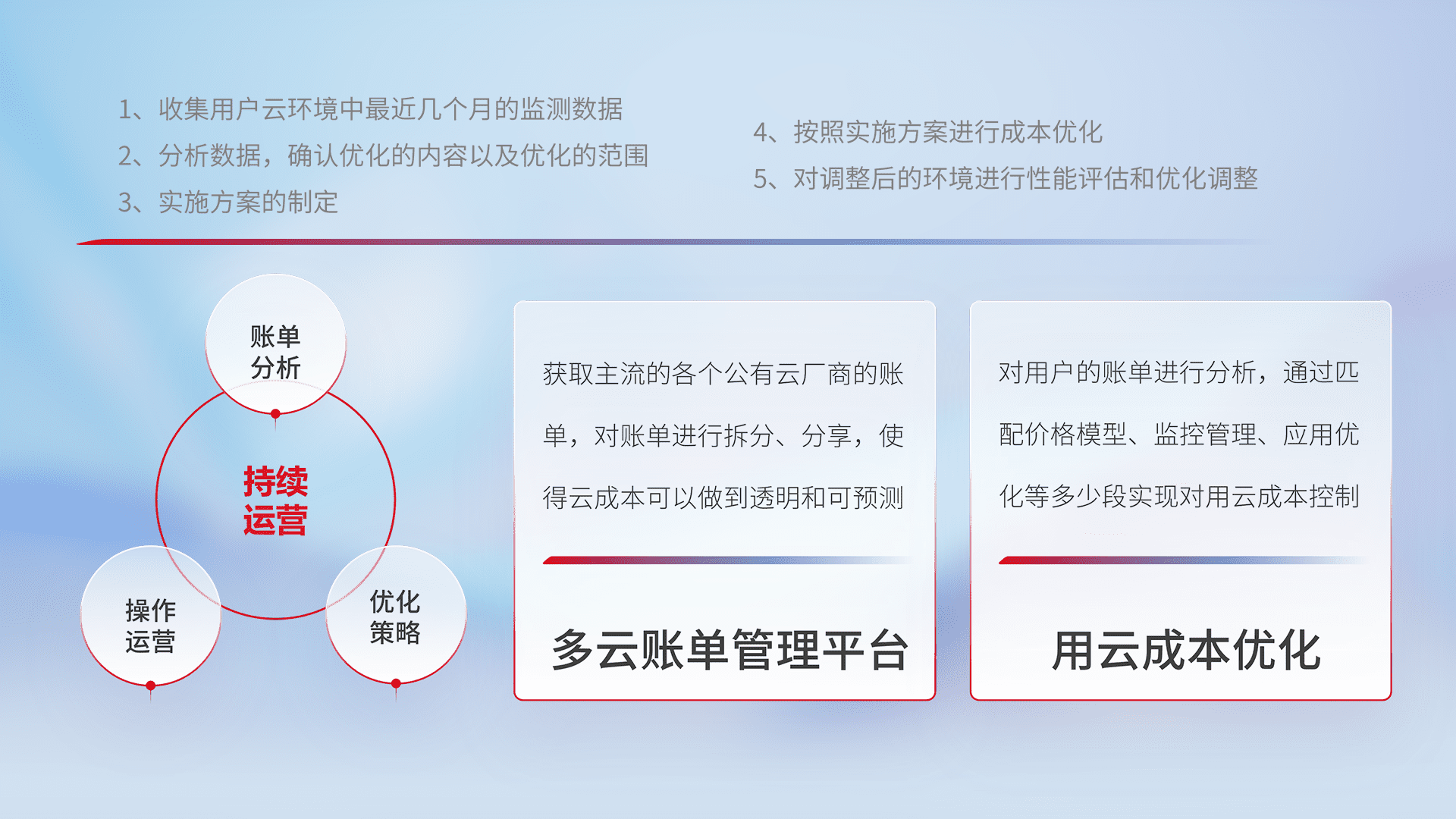 通过灵活运用多种自动化迁移工具,,,,帮助企业用户实现业务和数据高效 、、、稳定的上云迁移和云上迁移,,,采用自研多云纳管平台,,以中立管理模式,,解决多组织、、多云、、多运维厂商的复杂关系的管理,,,,保证多云平台资源配置的一致性,,实时掌控云资源运行数据,,运用智能化工具分析云资源多云平台的管理服务,,透明化管理成本支出,,,,用云成本可预测、、用云费用可优化、、云资源配额有据可依。。。。