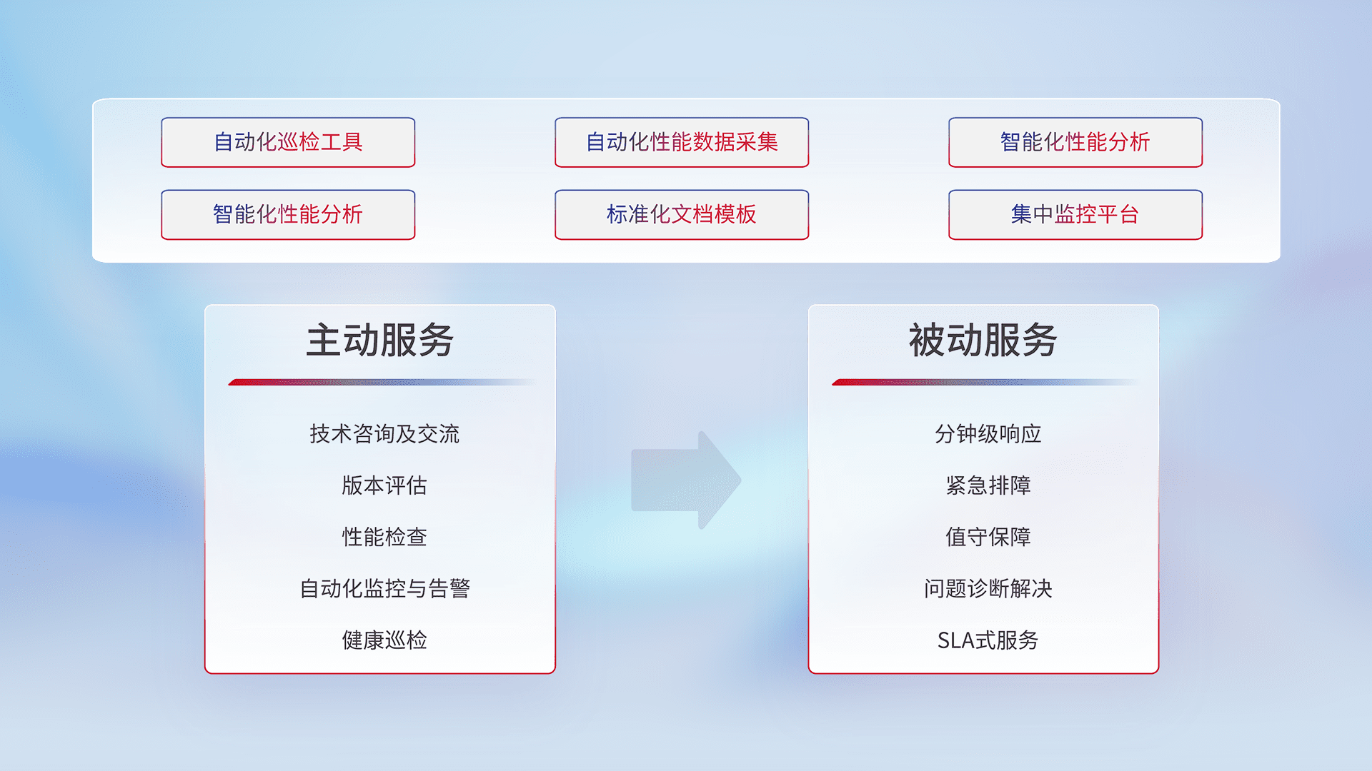 智能化工具和标准化文档,,,保障服务质量,,,提供主动服务(包含技术咨询、、版本评估、、、、性能检查、、、自动化监控与告警、、健康巡检)和被动服务包含(分钟级响应、、、紧急排障、、值守保障、、、、问题诊断解决、、SLA服务)。。。